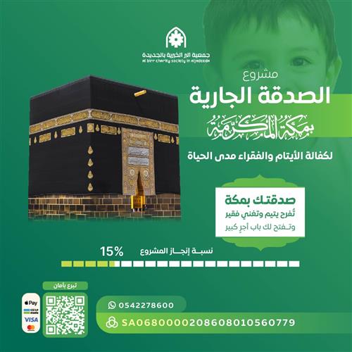 قال رسول الله صلى الله عليه وسلم( إِذَا مَاتَ ابنُ آدم انْقَطَعَ عَنْهُ عَمَلُهُ إِلَّا مِنْ ثَلَاثٍ: صَدَقَةٍ جَارِيَةٍ، أو عِلْمٍ يُنْتَفَعُ بِهِ، أَوْ وَلَدٍ صَالِحٍ يَدْعُو لَهُ. رَوَاهُ مُسْلِمٌ صدقتك بمكة.. تفرح يتيم وتغني فقير وتفتــــــــــــــــــــــــــــــح لك باب أجرٍ كبير